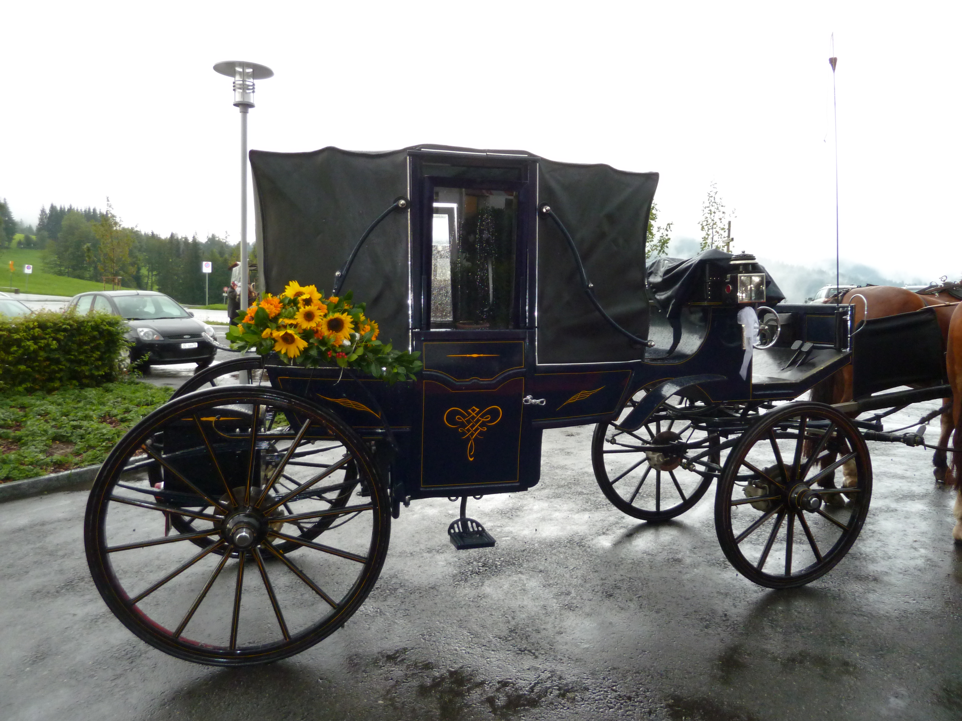 Hochzeitkutschen und Wagen mit Regenverdeck können auch für grosse Gesellschaften organisiert werden (bis ca. 140 Personen).